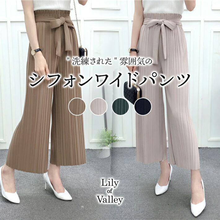 楽チンなのにきちんとおしゃれ ウエスト リボン付き アンクル丈 シフォン プリーツ ワイドパンツ レディース ボトムス フレア ロング丈 ミモレ丈 カジュアル 春夏 秋冬 韓国