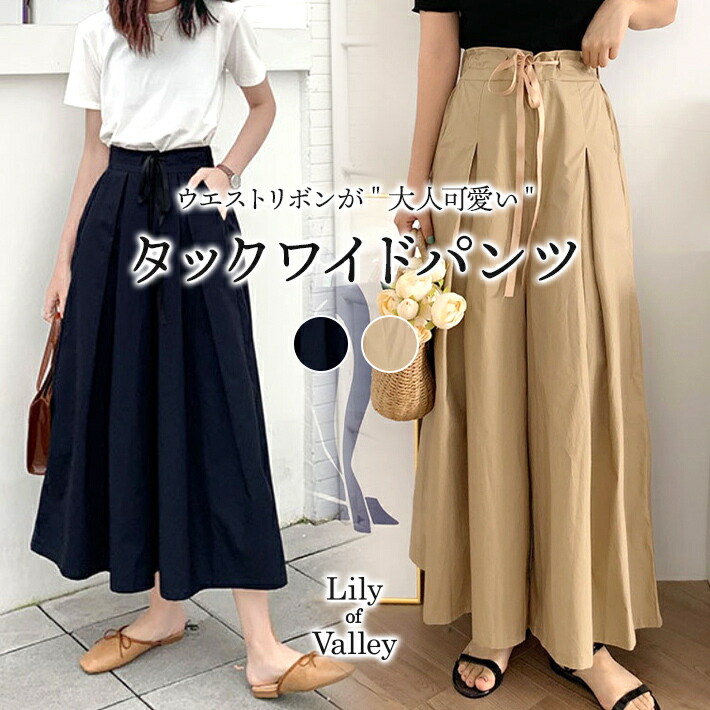 程良いラフさが大人のこなれスタイルを演出 ウエスト リボン カジュアル タック ワイド パンツ レディース ボトムス ガウチョ ロング丈 リゾート スカンツ フレアスカート 春夏