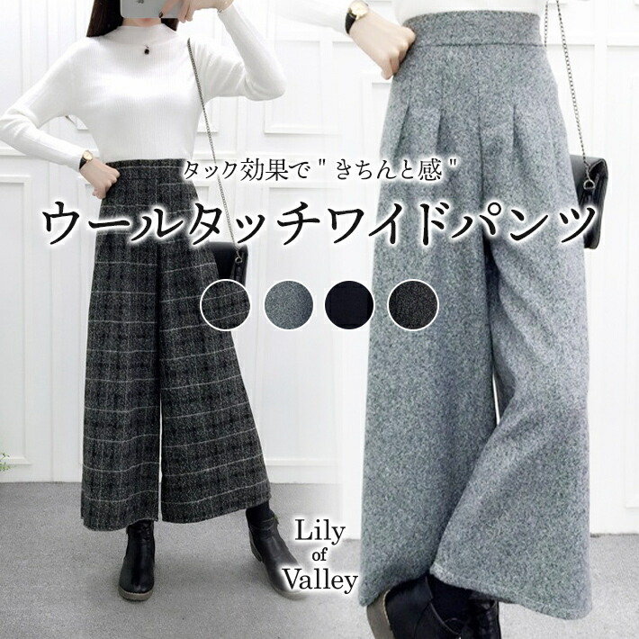 さりげない起毛感がシーズンムードを盛り上げる ウールタッチ ハイウエスト チェック ワイド パンツ レディース ボトムス ロング ウエストゴム きれいめ ミモレ丈 ウール 秋 冬