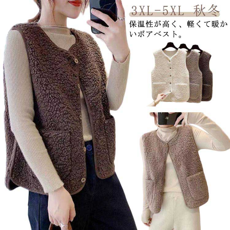 ボアベスト レディース あったかい お出かけ トップス 防寒 無地 ベスト 秋冬 ノースリーブ 前開き ベスト 羽織り おしゃれ 大きいサイズ ブラウン コーヒー ベージュ