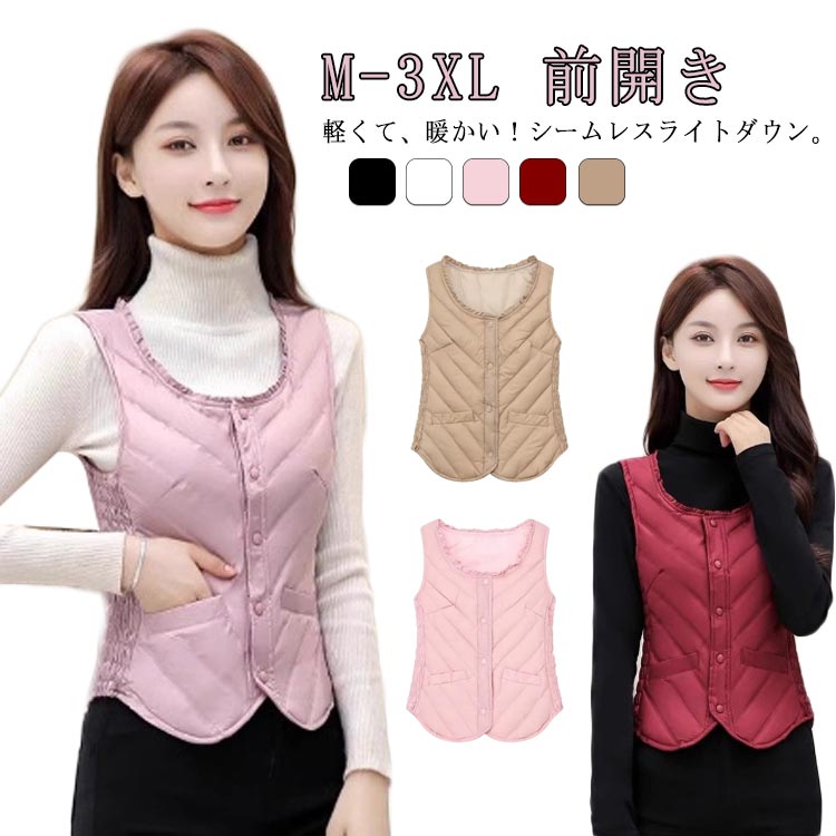 レディース ダウンベスト 前開き キルティング ダウン スリム ジレ 秋冬 ショート丈 ベスト インナーダウン スリムに見える ボタン 黒 白 ピンク ワインレッド ベージュ
