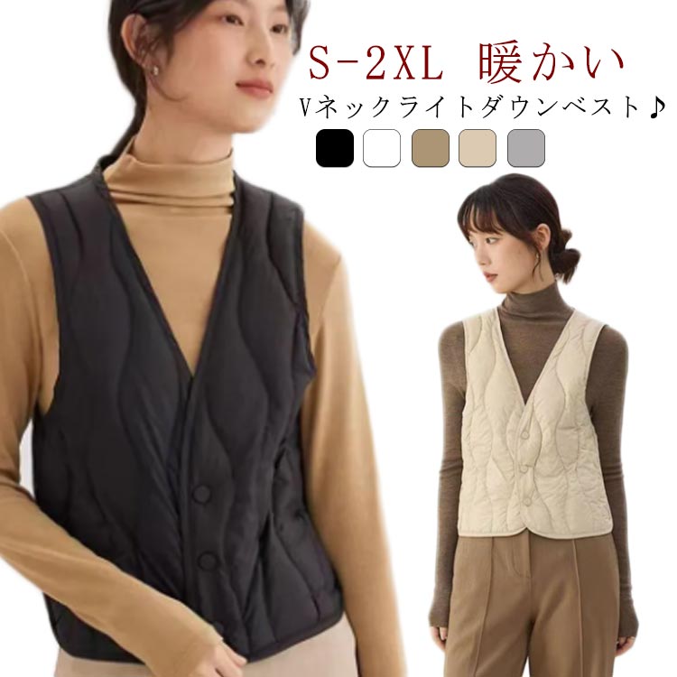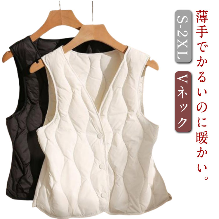 薄手でかるいのに暖かい インナーとして着込めば薄手のアウターでもあったか 中綿ベスト Vネック ボタン インナーベスト レディース 防寒 薄い 無地 シンプル ショート丈