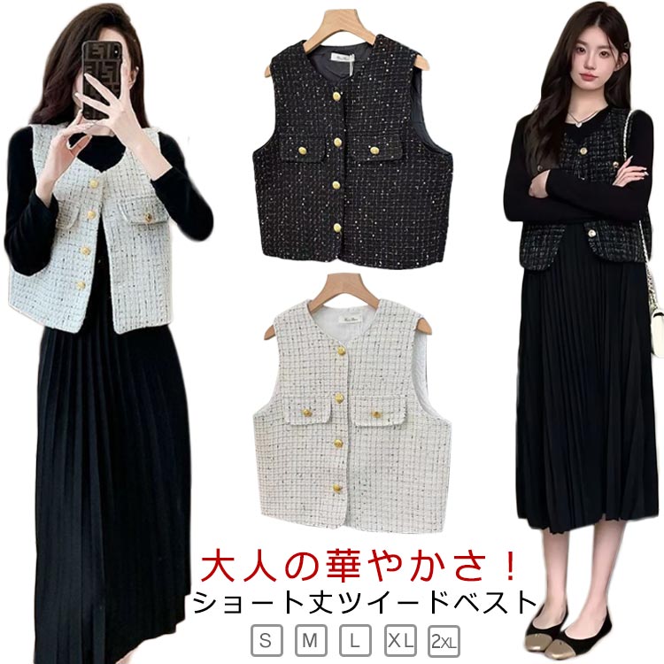 大人の華やかさ ツイードベスト レディース ツイード ジレ ベスト ネック 前開き 春 秋 冬 お出かけ 通勤 ママコーデ 演奏会 謝恩会 披露宴 二次会 パーティー お呼ばれ 女子会 結婚式
