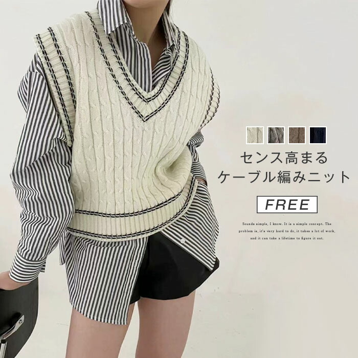 ニット ベスト レディース 春 秋 ケーブル編み Vネック ニット ベスト トップス 重ね着 ベスト ノースリーブ レイヤード風 無地 シンプル カジュアル おしゃれ 着回し 体型カバー