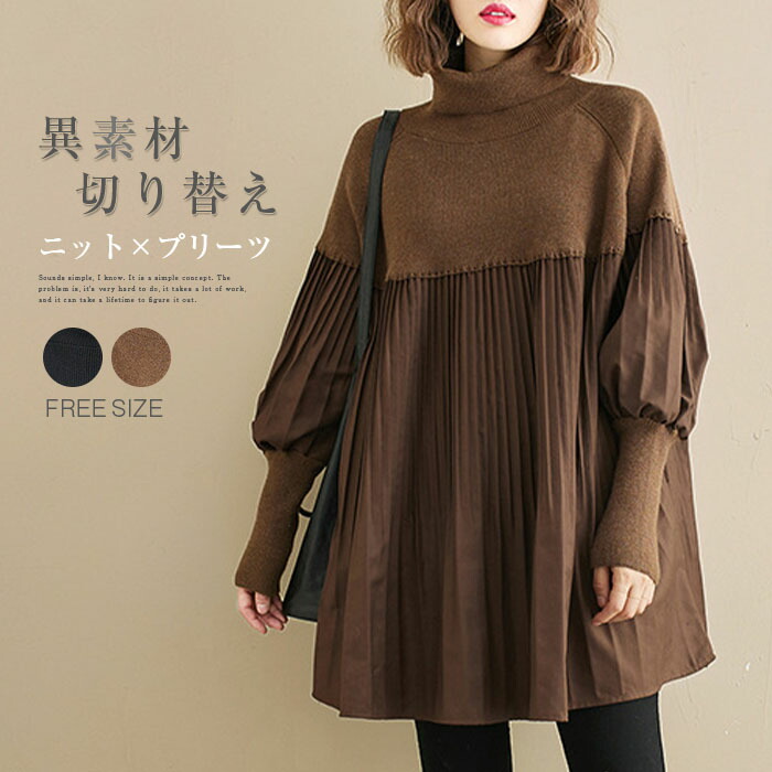 チュニック レディース 春 秋 異素材 ニット 切り替え ハイネック Tシャツ ブラウス プリーツ チュニック ワンピース 長袖 大きいサイズ チュニックワンピ プリーツ ニット ゆったり