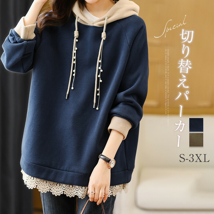 パーカー レディース 秋冬 フード付き パーカー 切り替え トップス パーカー 長袖 ゆったり フェミニン 着回し シンプル