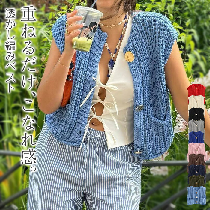 ニットベスト レディース 春 秋 透かし編み 前開き ニット ベスト トップス 重ね着 ベスト ノースリーブ レイヤード風 シンプル カジュアル おしゃれ 着回し 体型カバー ナチュラル