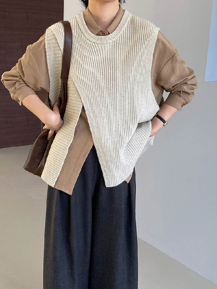 ニットベスト レディース 春 秋 冬 ニットタンクトップ ネック ニット タンクトップ 不規則 トップス 重ね着 ベスト ノースリーブ アシンメトリー タンク レイヤード レイヤード風