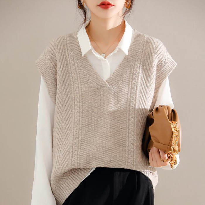 ニット ベスト レディース 春 秋 Vネック ケーブル編み トップス 重ね着 ベスト ノースリーブ レイヤード風 シンプル カジュアル おしゃれ 着回し