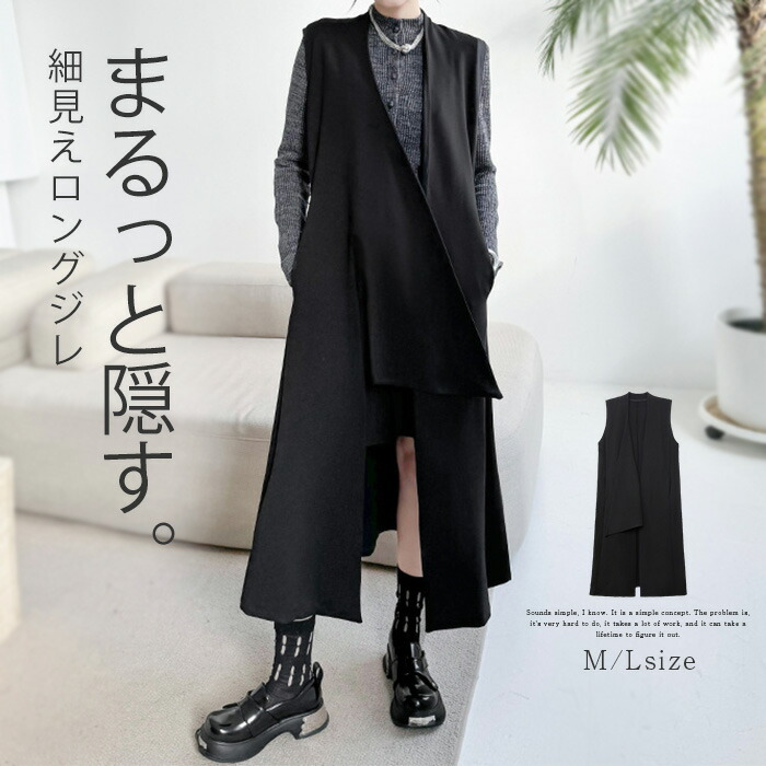 ジレ ベスト レディース 不規則 春 秋 ロング丈 ジレ 個性的 ノースリーブ シワになりにくい レイヤード 重ね着 羽織り 無袖 お洒落 きれいめ 着痩せ 大きいサイズ 体型カバー シンプル