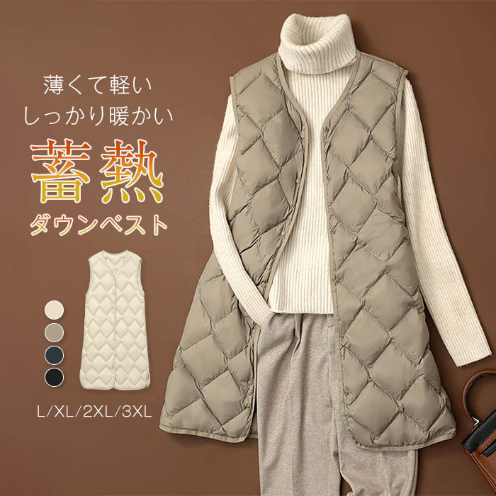 キルティング ベスト レディース ダウン インナー ベスト ロング ジレ Vネック 収納袋付き ダウン ベスト アウター アウトドア ロング丈 軽量 大きいサイズ ノースリーブ フロントボタン