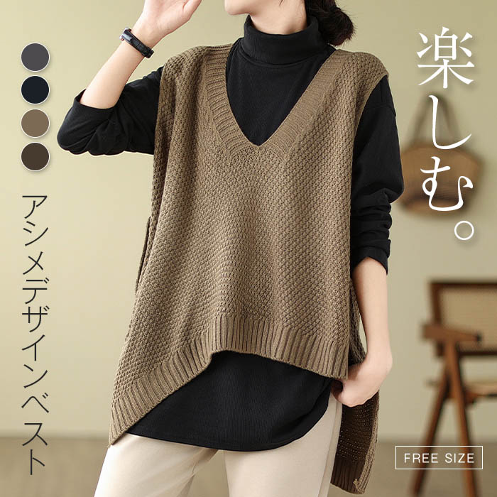 ニットベスト レディース 春 秋 冬 ニットタンクトップ Vネック ニット タンクトップ 不規則 トップス 重ね着 ベスト ノースリーブ アシンメトリー タンク レイヤード レイヤード風