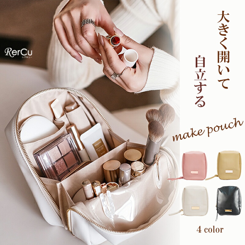 ファスナーを全開にしても自立するポーチ 中身が見やすく、取り出しやすい 整理されたパーティション、自立する縦型収納で取り出し、収納がスマートに