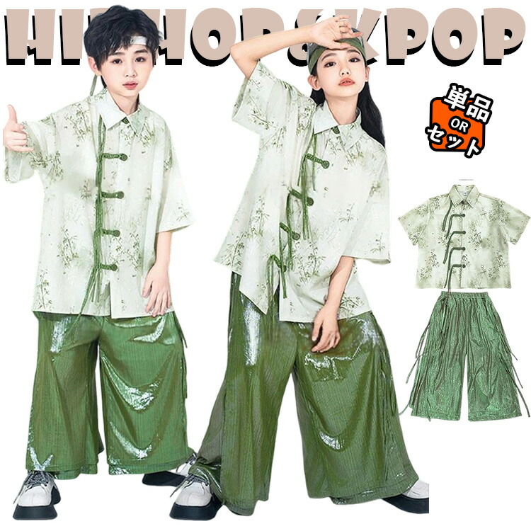 チャイナ風 古典 カジュアルシャツ グリーン パンツ キッズ ダンス衣装 セットアップ 上下セット おしゃれ 女の子 男の子 子供 かっこいい かわいい 半袖 トップス 唐装 ダンスウエア