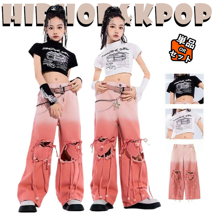 韓国 jazz 黒 白 トップス ピンク デニムパンツ ダメージ加工 キッズ ダンス衣装 セットアップ 上下セット おしゃれ 女の子 子供 かっこいい かわいい へそ出し 半袖 Tシャツ ダンス