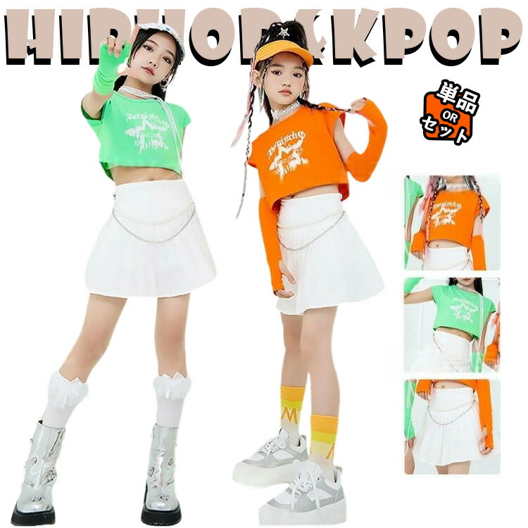 韓国 jazz 緑 橙 トップス ホワイト プリーツスカート キッズ ダンス衣装 セットアップ 上下セット おしゃれ 女の子 子供 かっこいい かわいい へそ出し 半袖 ダンスウエア ヒップホ