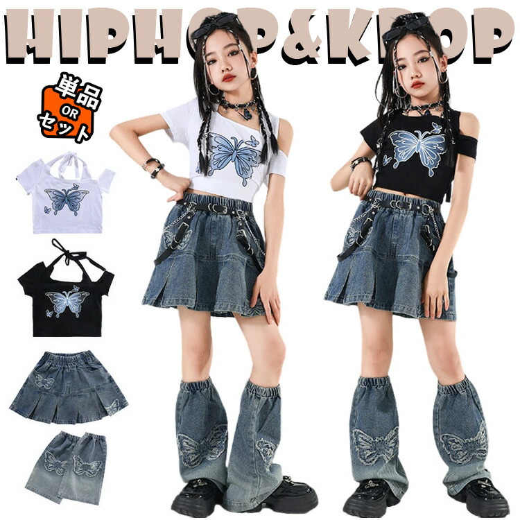 黒 白 トップス ブルー デニム スカート 足カバー キッズ ダンス衣装 セットアップ 上下セット 韓国 おしゃれ 女の子 子供 かっこいい かわいい へそ出し 半袖 シャツ ダンスウ
