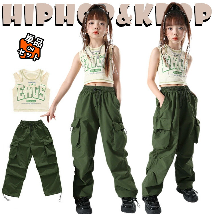 韓国 jazz ベージュ タンクトップ グリーン カーゴパンツ キッズ ダンス衣装 セットアップ 上下セット おしゃれ 女の子 子供 かっこいい かわいい へそ出し ノースリーブ トップス ダ