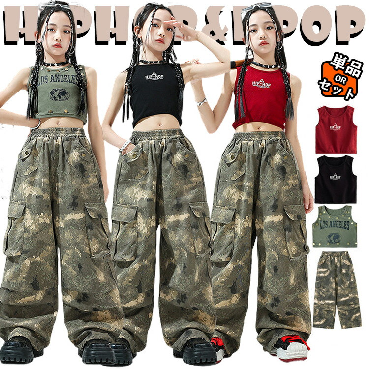 迷彩柄 パンツ ダンスパンツ キッズ ダンス衣装 セットアップ 女の子 韓国- 3色 おしゃれ チア チアガール タンクトップ へそ出し 肩だし トップス サルエルパンツ カーゴパ