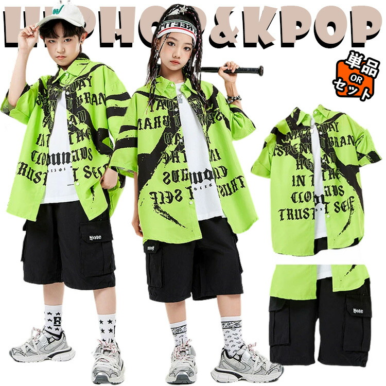緑色 総柄 キッズ ダンス衣装 セットアップ 女の子 男の子 半袖 カジュアルシャツ ファッション 派手 おしゃれ トップス シャツ かっこいい トップス ヒップホップ ジャズダンス jaz