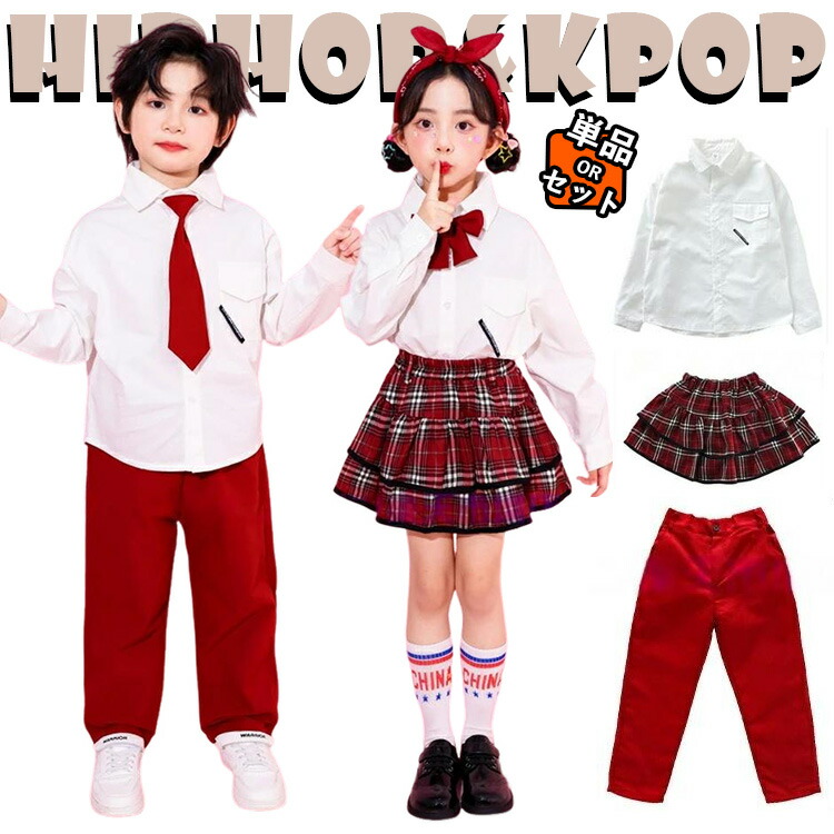 レッド チェック柄 スーツ キッズ ダンス衣装 セットアップ 女の子 男の子 子供 チア チアガール 長袖トップス シャツ ネクタイ スカート パンツ おしゃれ ゆったり カジュア ジャズ