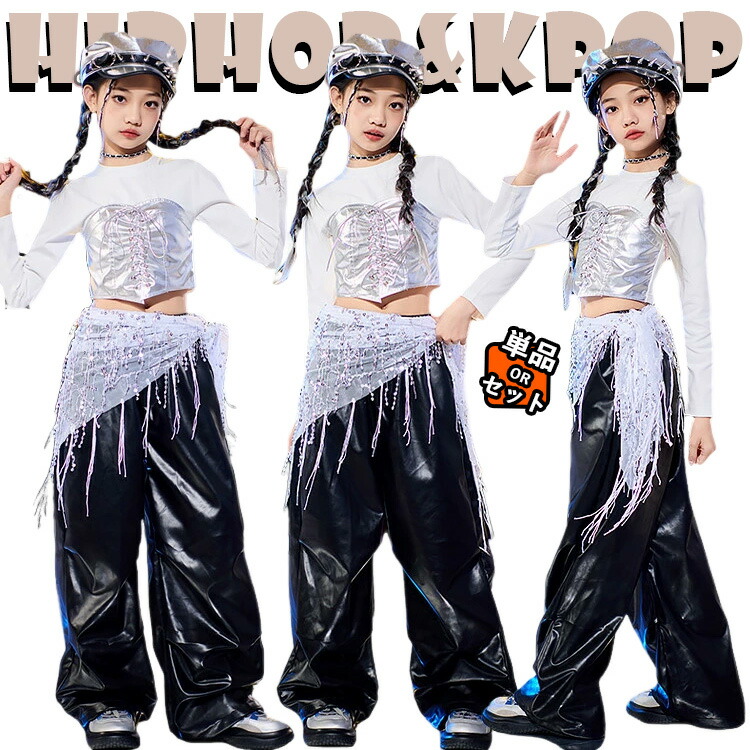 シルバー トップス ブラック レザーパンツ ベルト ベレー帽 キッズ ダンス衣装 セットアップ 上下セット おしゃれ 韓国 女の子 かわいい かっこいい へそ出し シャツ ダンスウ