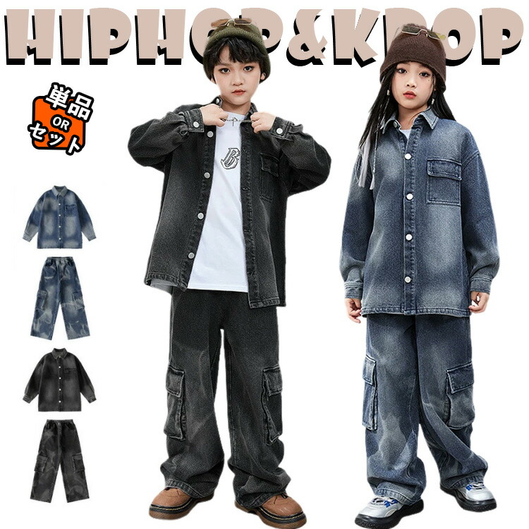 黒 紺 デニム ジャケット パンツ セットアップ キッズ ダンス衣装 上下セット ゆったり おしゃれ 長袖 白 シャツ 女の子 男の子 カジュアル トップス デニムパンツ ダンスウエア ヒ