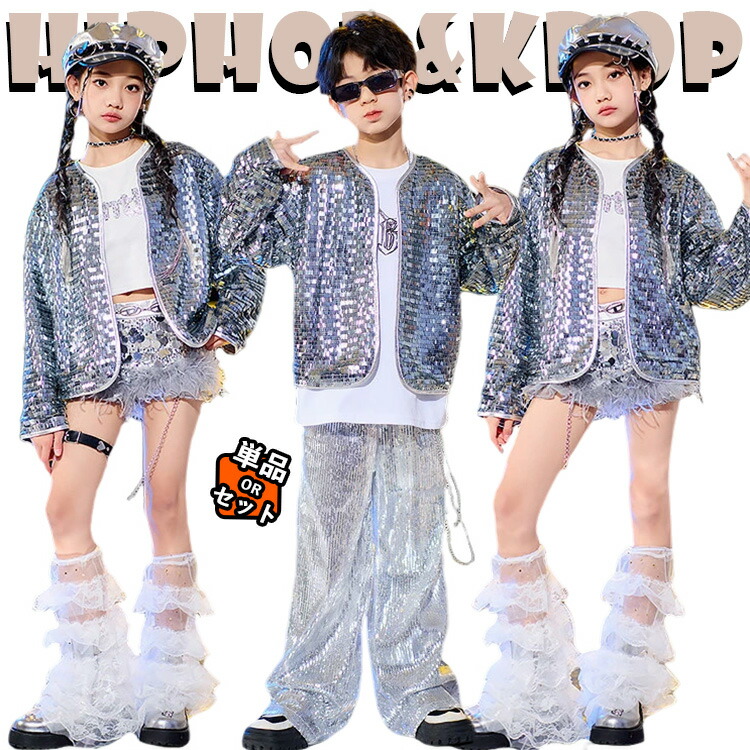 キッズ ダンス衣装 シルバー ジャケット スパンコール パンツ セットアップ 上下セット おしゃれ 女の子 男の子 ゆったり Tシャツ タンクトップ カジュアル キラキラ ダンスウエア ヒ