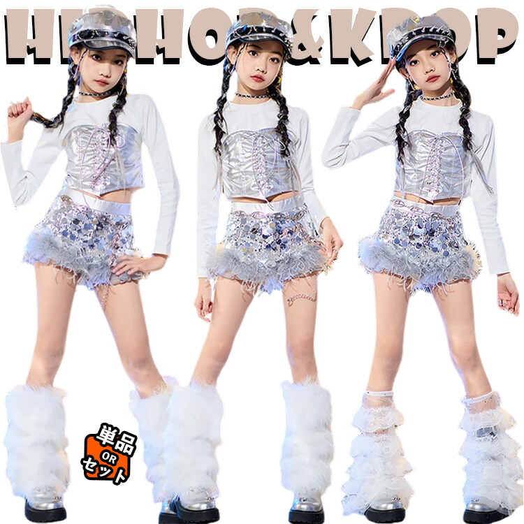 シルバー トップス パンツ スパンコール ベレー帽 レッグウォーマー キッズ ダンス衣装 セットアップ 上下セット おしゃれ 女の子 韓国 かわいい かっこいい へそ出し ダンスウ