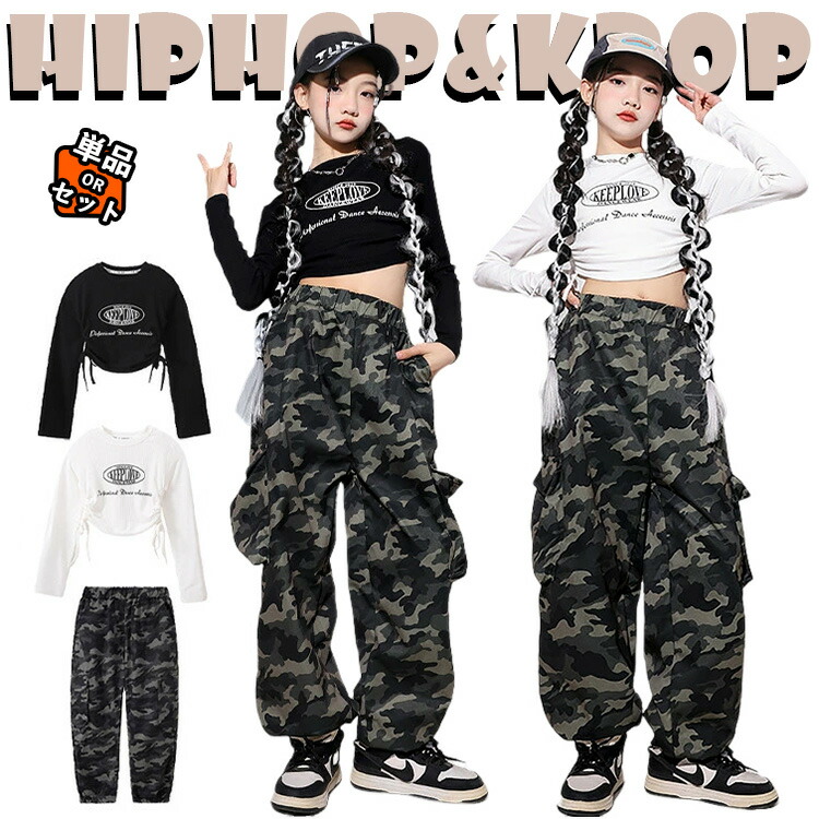 黒 白 トップス 迷彩 カーゴパンツ キッズ ダンス衣装 セットアップ 上下セット おしゃれ 女の子 韓国 jazz かわいい かっこいい へそ出し 長袖 Tシャツ ダンスウエア ヒップホップ