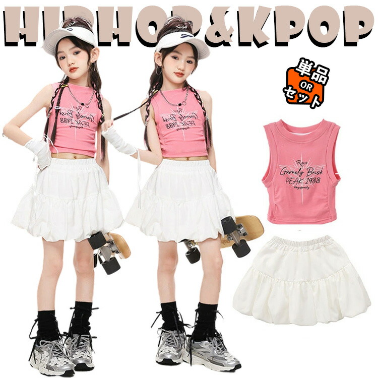 韓国 チア チアガール 白 プリーツスカート ピンク トップス キッズ ダンス衣装 セットアップ 可愛い - おしゃれ 女の子 へそ出し タンクトップ スカート ヒップホップ ジャ