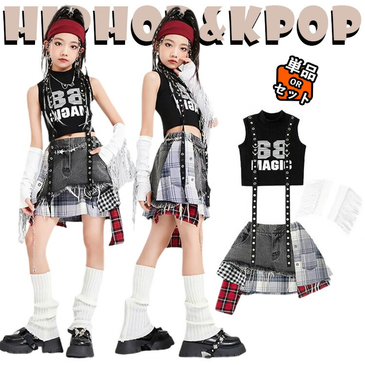 韓国 jazz チア チアガール デニムスカート チェック柄 黒 トップス かっこいい 女の子 キッズ ダンス衣装 セットアップ 可愛い k-pop おしゃれ かわいい へそ出し タンクトップ スカ