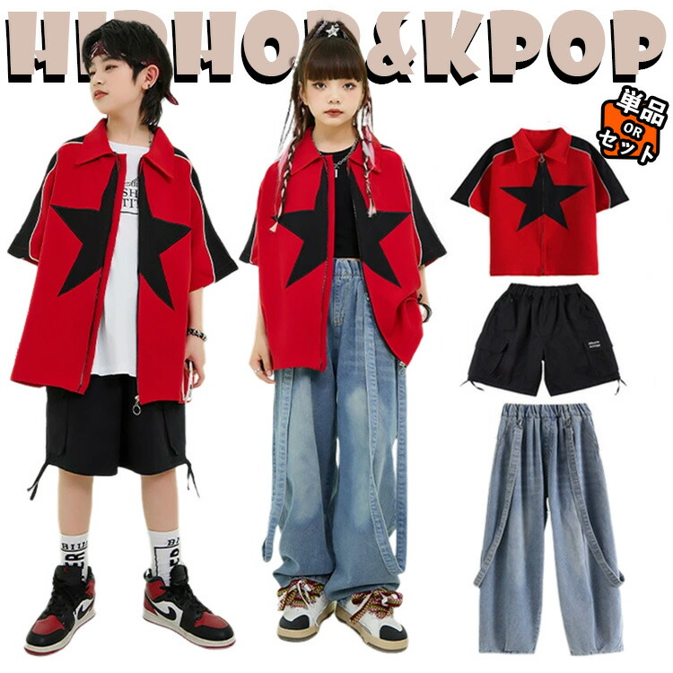韓国 k-pop ヒップホップ 赤色 シャツ デニムパンツ 黒 半ズボン かっこいい 女の子 男の子 キッズ ダンス衣装 セットアップ おしゃれ かわいい へそ出し タンクトップ Tシャツ jazz