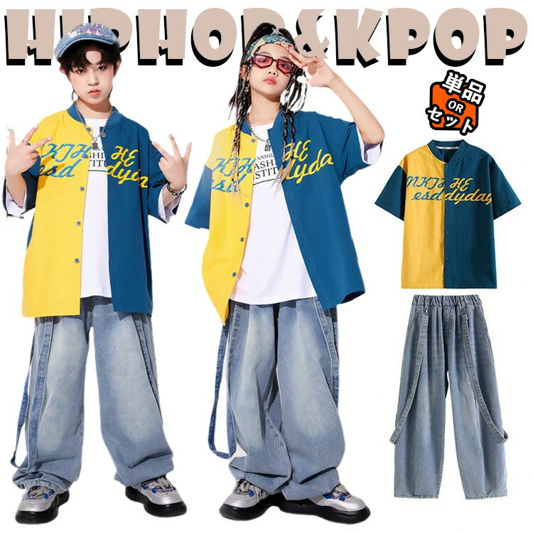 ヒップホップ デニムパンツ シャツ イエロー 青い かっこいい 女の子 男の子 キッズ ダンス衣装 セットアップ 韓国 - おしゃれ 半袖 シャツ ジャズダンス ダンスウェア 発表会