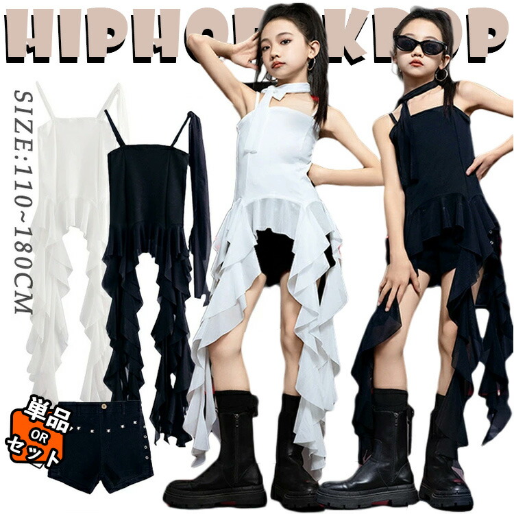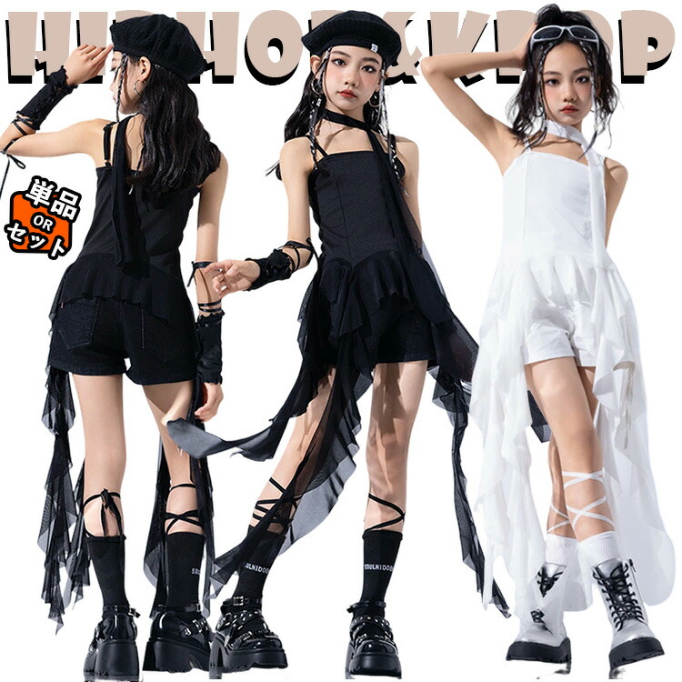 キッズ ダンス衣装 セットアップ 白色 黒色 チア チアガール 女の子 キャミソール ワンピース ファッション 韓国 k-pop おしゃれ ジャズダンス ヒップホップ 発表会 団体服 演出服 応