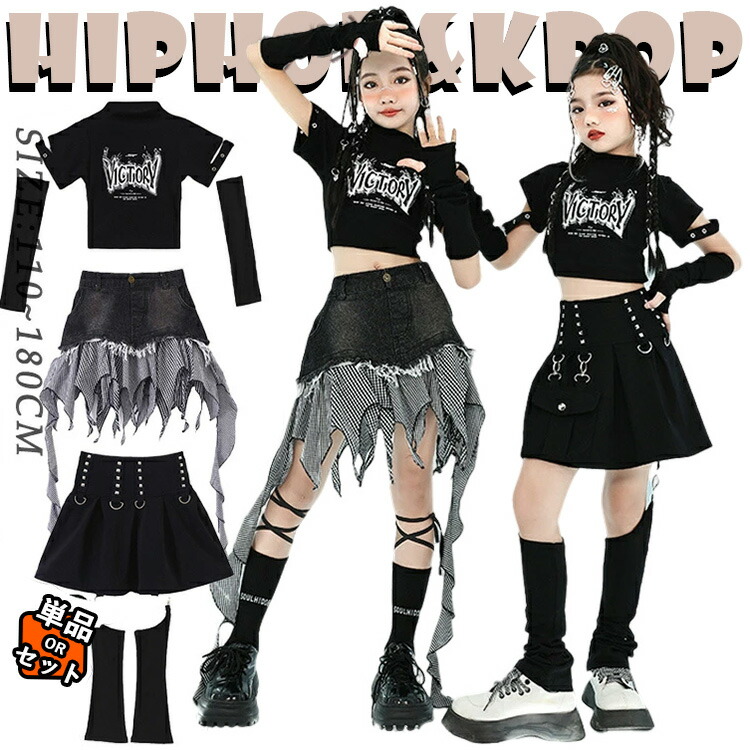 黒 白 赤 トップス スカート 靴下 キッズ ダンス衣装 セットアップ 上下セット おしゃれ 韓国 jazz 女の子 かわいい かっこいい へそ出し Tシャツ キラキラ ダンスウエア ヒップホッ