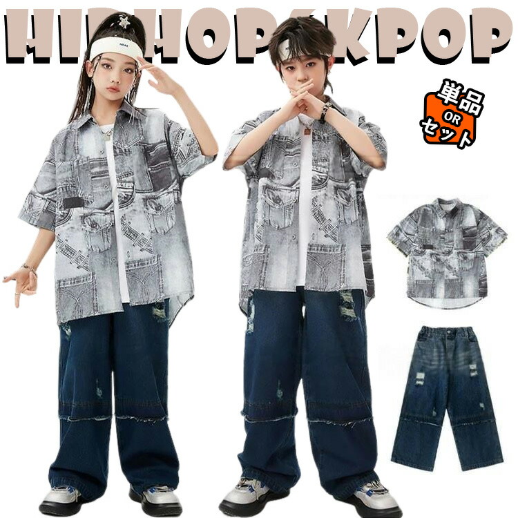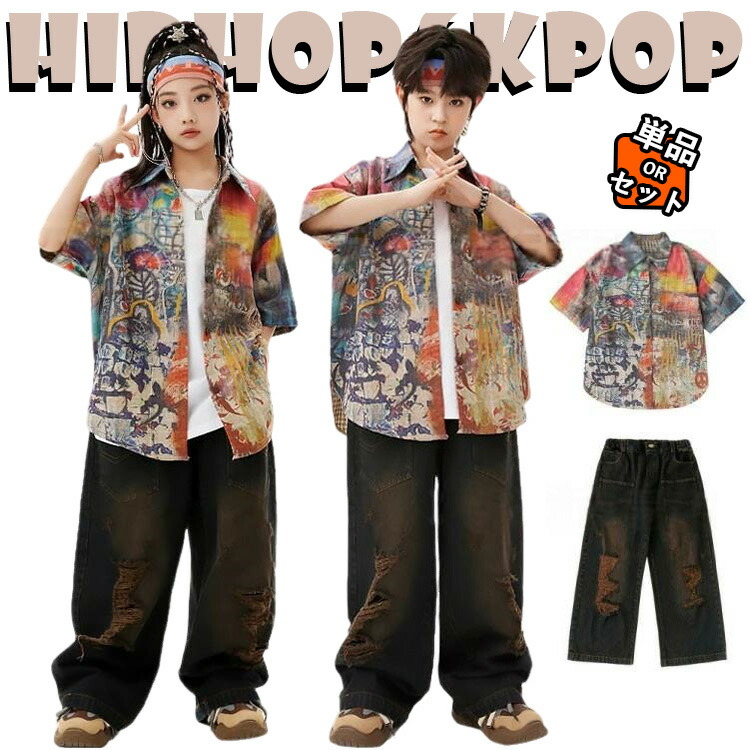 総柄 カジュアルシャツ 黒 デニムパンツ ダメージ加工 キッズ ダンス衣装 セットアップ 上下セット おしゃれ 女の子 男の子 かっこいい かわいい トップス タンクトップ ダンスウエア