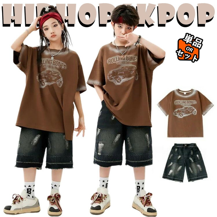 ブラウン トップス ブラック デニムパンツ キッズ ダンス衣装 セットアップ 上下セット おしゃれ 女の子 男の子 子供 かっこいい かわいい 半袖 シャツ ダンスウエア ヒップホップ