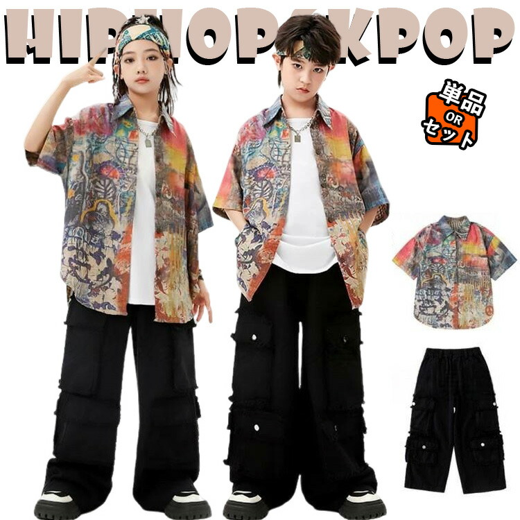 総柄 カジュアルシャツ 半袖 ブラック カーゴパンツ キッズ ダンス衣装 セットアップ 上下セット おしゃれ 女の子 男の子 かっこいい かわいい トップス タンクトップ ダンスウエア