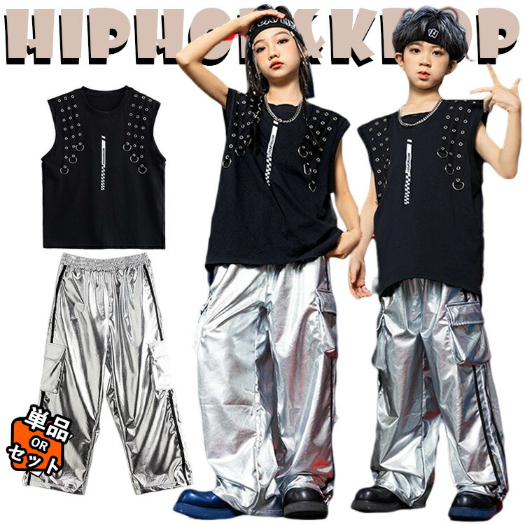カーゴパンツ シルバー キッズ ダンス衣装 セットアップ ヒップホップ タンクトップ 袖なし カーゴパンツ 光沢 - 衣装 韓国 カコイイ 男の子 女の子 ヒップホップ ゆるパンツ キ