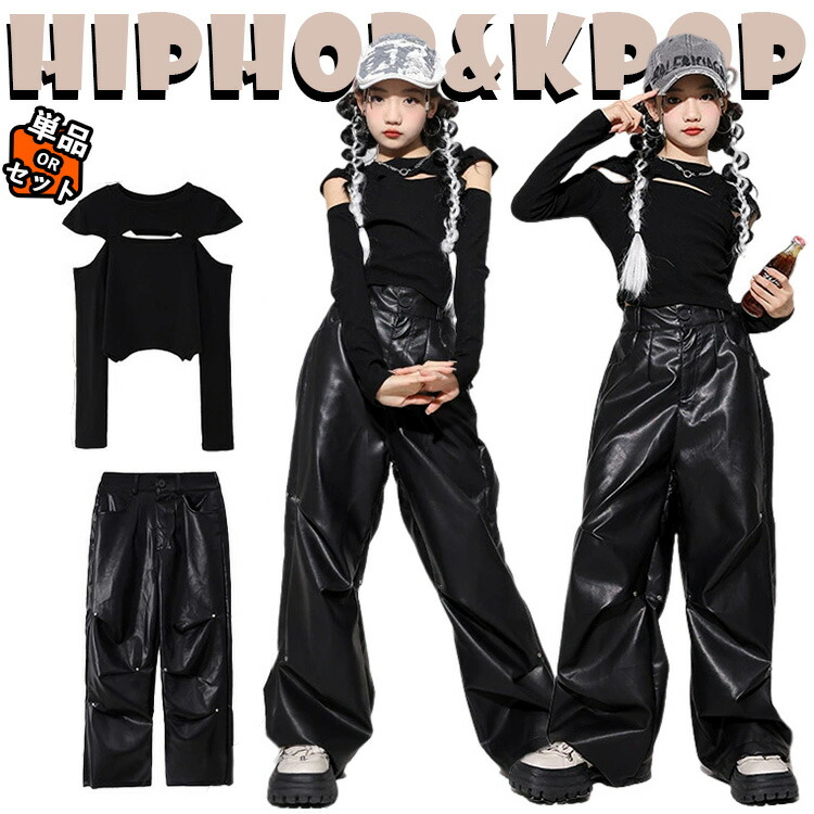 チア チアガール 女の子 レザーパンツ ショートトップ 肩出し 長袖 春 夏 黒 韓国 - カーゴパンツ 上下セット トップス キッズ ダンス衣装 セットアップ
