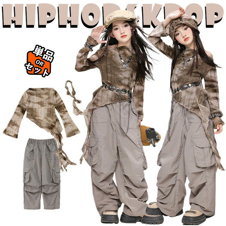 パンク系 ダメージ加工 チア チアガール キッズ ダンス衣装 女の子 上下セット 春 夏 秋 jazz 韓国 k-pop HIPHOP カーゴパンツ トップス セットアップ ワイドパンツ 長袖 ジャズ