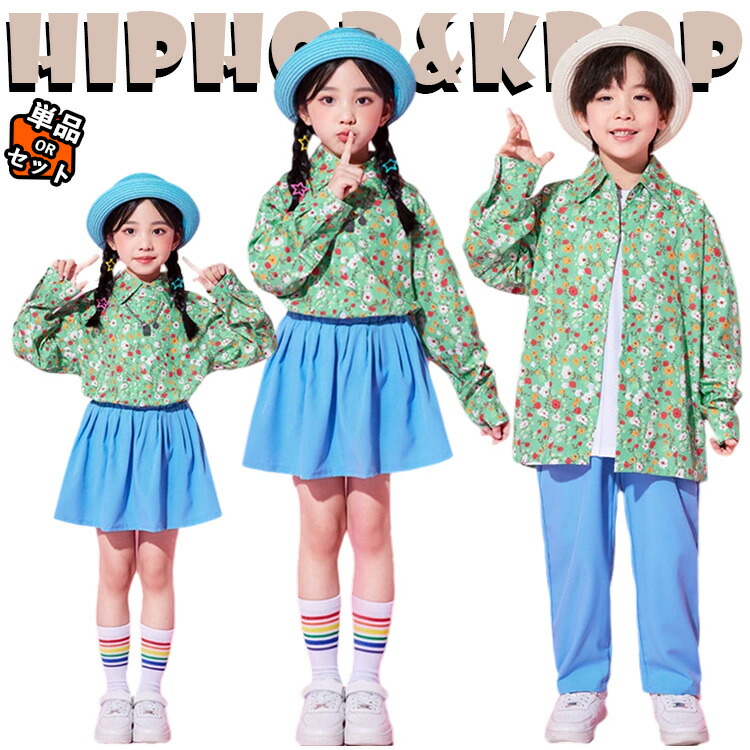 花柄 グリーン ブルー キッズ ダンス衣装 女の子 男の子 上下セット 春 夏 秋 小学生 クラス服 発表会 長袖シャツ シャツ スカート パンツ 総柄 セットアップ 可愛い ゆったり おし