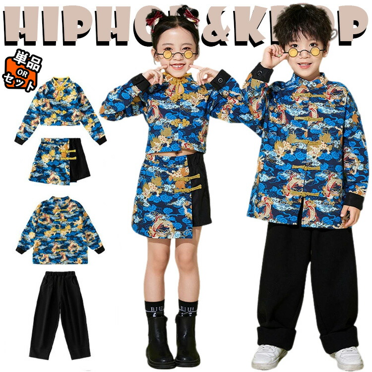 古典風 中国風 総柄 上下セット キッズ ダンス衣装 女の子 男の子 小学生 クラス服 発表会 長袖 トップス ショートスカート ワイドパンツ ブルー 黒色 セットアップ 可愛い ゆったり