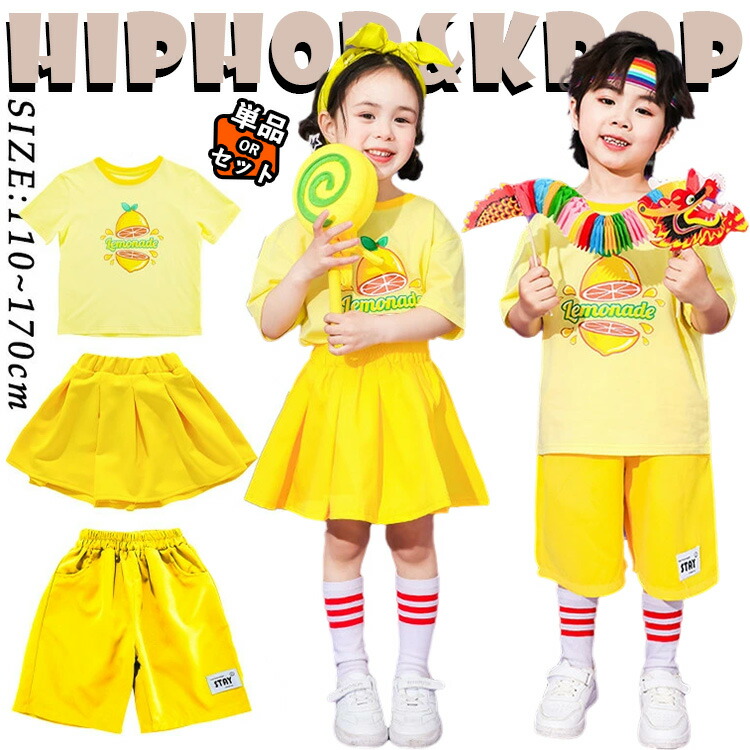 イエロー レモン 黄色 キッズ ダンス衣装 上下セット 女の子 男の子 小学生 クラス服 発表会 半袖 Tシャツ スカート 短パン 半ズボン プリーツスカート 総柄 セットアップ 可愛い カ