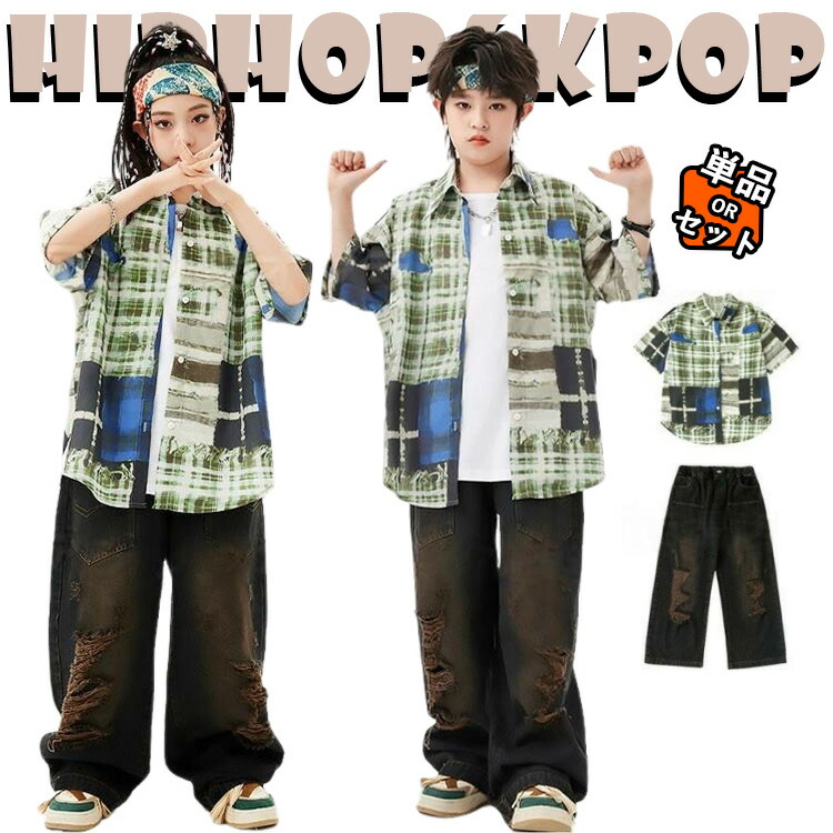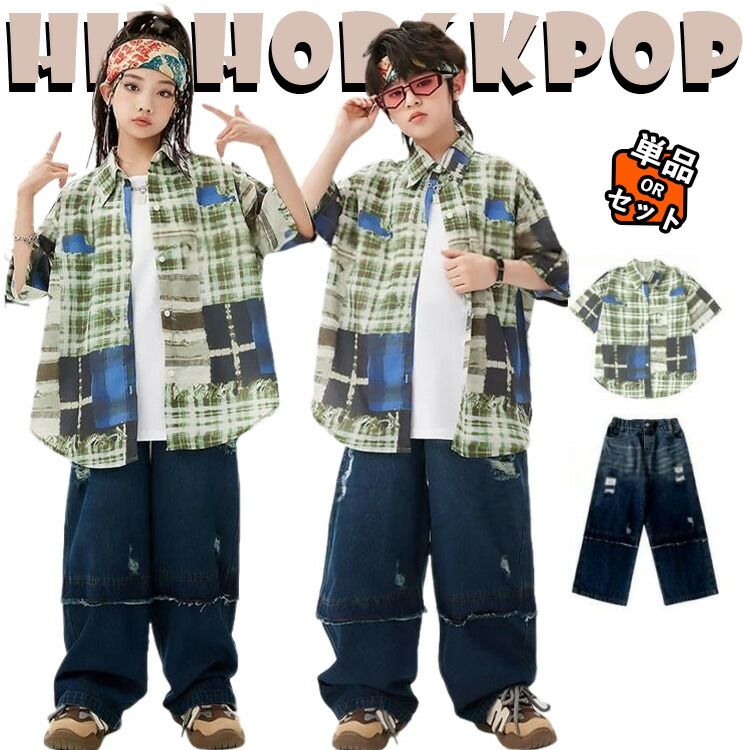 チェック柄 緑 カジュアルシャツ ネイビー デニムパンツ キッズ ダンス衣装 セットアップ 上下セット おしゃれ 女の子 男の子 かっこいい かわいい トップス タンクトップ ダンスウエ