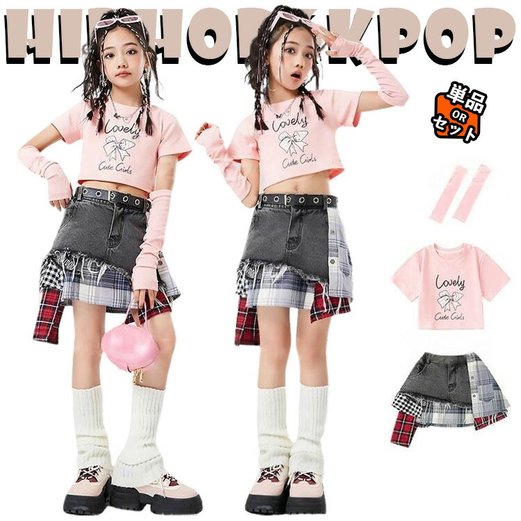 韓国 jazz ピンク トップス 腕カバー グレー チェック柄 スカート 足カバー キッズ ダンス衣装 セットアップ おしゃれ 女の子 かっこいい かわいい ゆったり 半袖 ヒップホップ ジャ