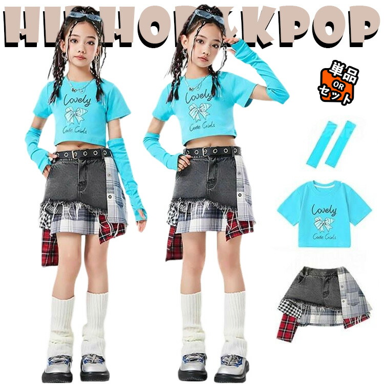 韓国 jazz ブルー トップス 腕カバー グレー チェック柄 スカート 足カバー キッズ ダンス衣装 セットアップ おしゃれ 女の子 かっこいい かわいい ゆったり 半袖 ヒップホップ ジャ