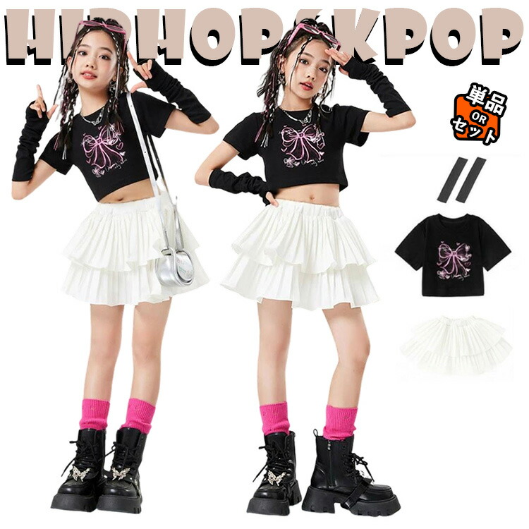 ブラック トップス 腕カバー ホワイト スカート 足カバー キッズ ダンス衣装 韓国 jazz セットアップ おしゃれ 女の子 かっこいい かわいい ゆったり 半袖 へそ出し ヒップホップ ジ