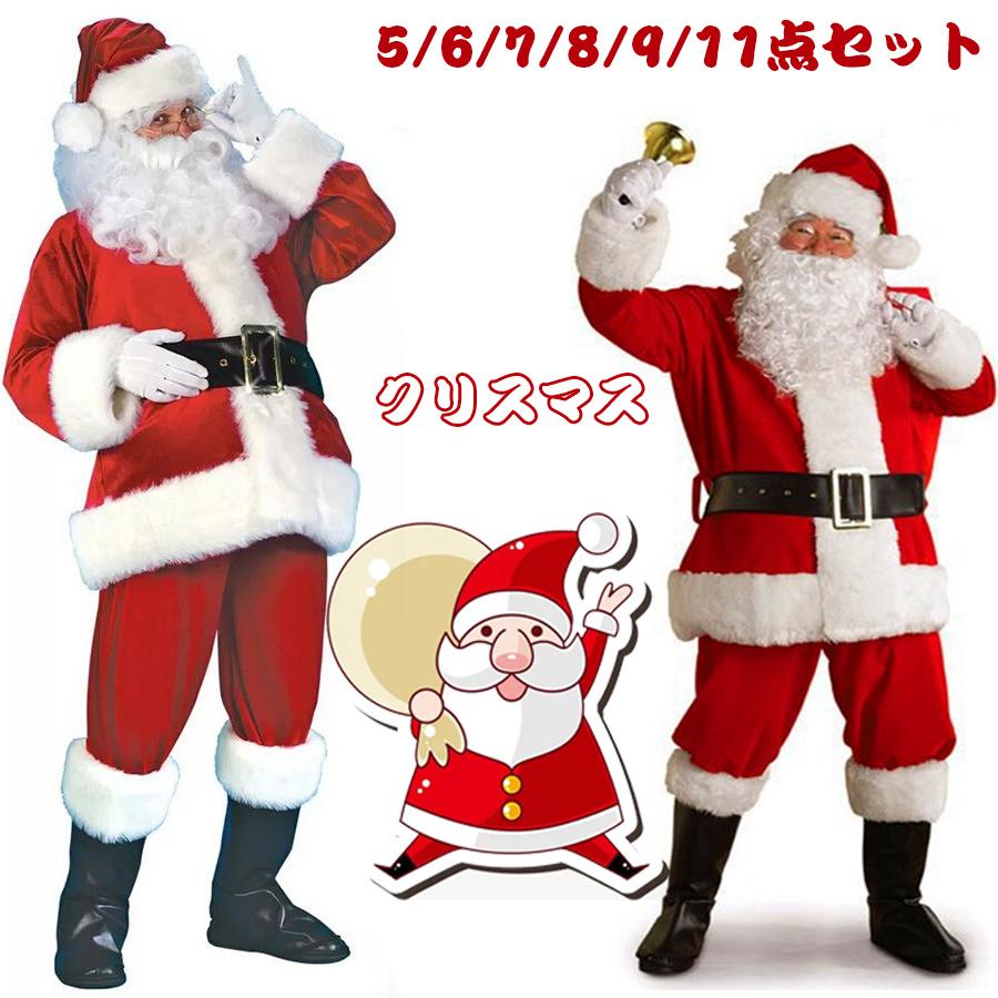 サンタ コスプレ メンズ クリスマス レディース コスプレ 大きいサイズ 上下セット パーティー サンタ衣装 帽子 ヒゲ 上着 ウエストベルト ズボン 靴カバー